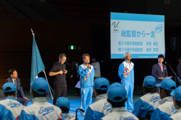 大会に向けて、競技ごとの代表者による決意表明や国スポ・障スポ総監督が目標を掲げることで、佐賀県選手団の一体感を高めるとともに、各選手の大会への士気を奮い立たせる場となりました。