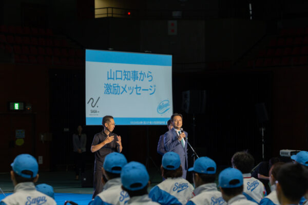 また、佐賀県知事からの激励メッセージ、佐賀商業高校吹奏楽部、PopCandy新体操クラブによる応援パフォーマンスも行われ、大会に向けて大いに気持ちを盛り上げることができました。